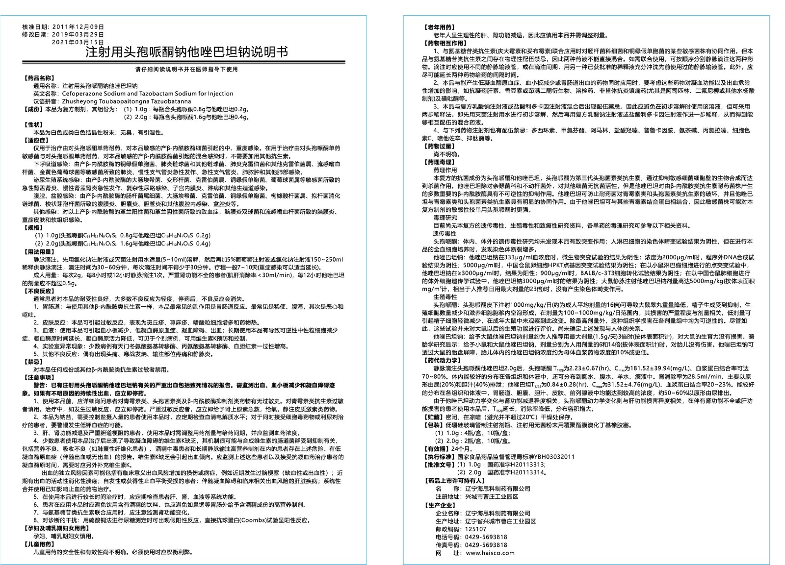 【藥品規(guī)格】1.0g(頭孢哌酮0.8g和他唑巴坦鈉0.2g)2.0g(頭孢哌酮1.6g和他唑巴