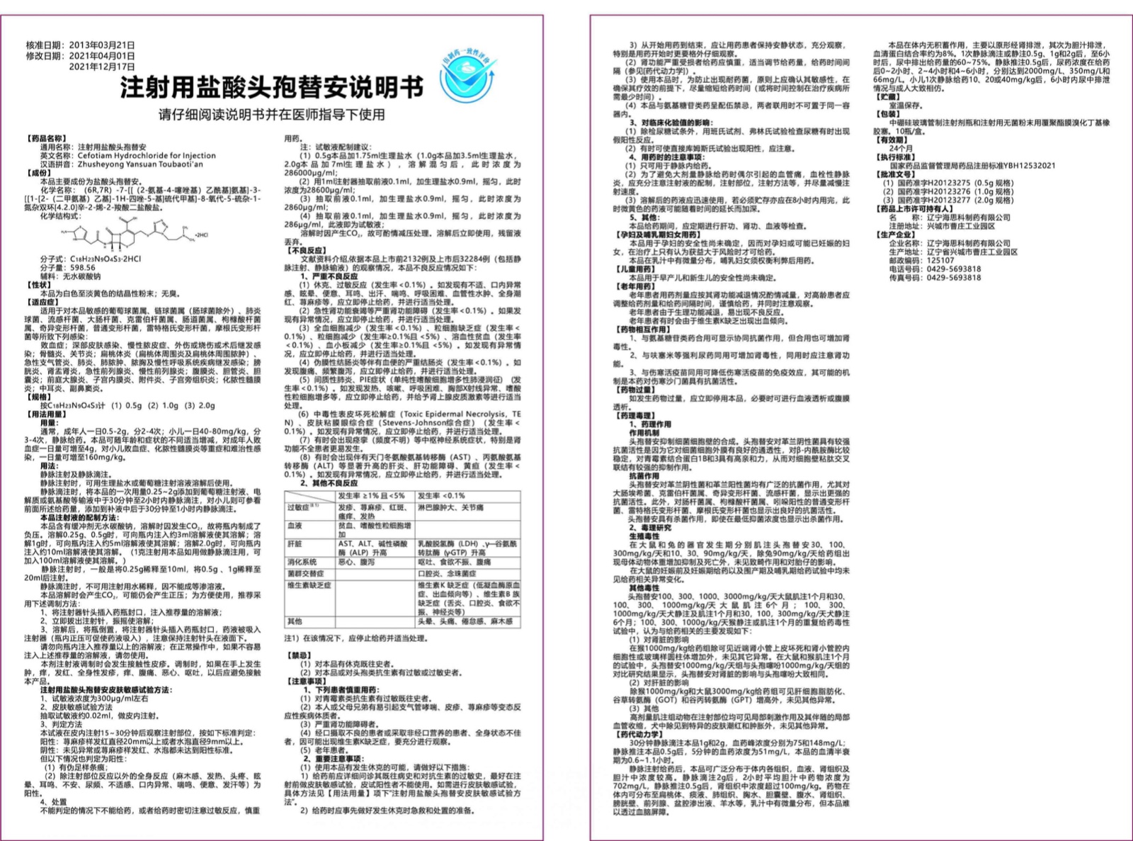 【通用名】注射用鹽酸頭孢替安
